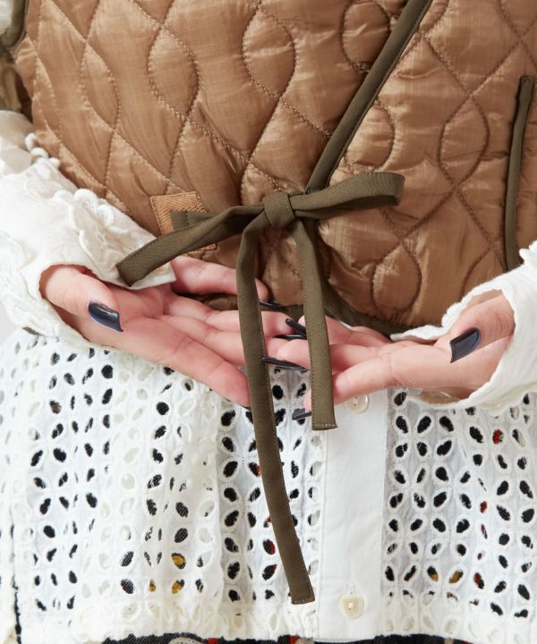 大胆な刺しゅうと総柄の裏地など、ディテールにもこだわったキルティングベスト。和コーディネートにも合わせやすい「重ね」を重視した、個性的な短丈仕様。裏地までこだわったポケット付き。刺しゅうには金糸を使用、グラデーションでさらに豪華さを演出しました。柄は中国の国花(牡丹)と日本の国花(菊)、さらに日本の縁起の良い生き物である鶴と中国の威厳の象徴である虎を融合させたもの。シルクロードで出会う中国のオリエンタルな雰囲気を刺しゅうに落とし込みました。英文の意味は「時代を超えたシルクロードの旅 牡丹と菊」。