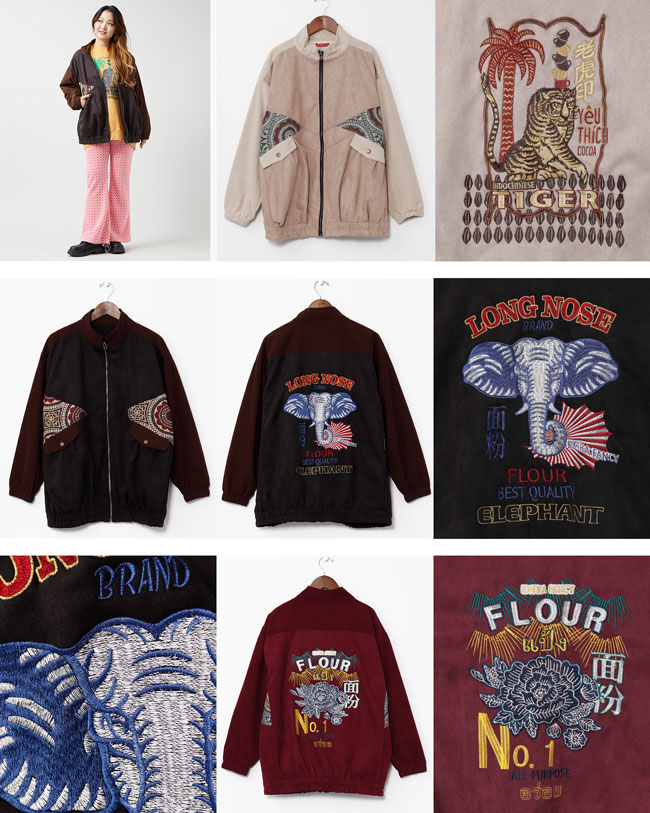 アクティブシーンでも大活躍間違いなしの、コーデュロイ・フェイクスエードジャケット。ゆったりとしたシルエットで、体型やコーディネートを問わず着用可能。ゴブラン生地の大胆なパッチワークが唯一無二の個性を引き出してくれます。ボタン付き収納ポケットとサイドポケット付き。文明開化を題材に、海外と日本の文化を織り交ぜたレトロパッケージを大胆に刺しゅうしました。