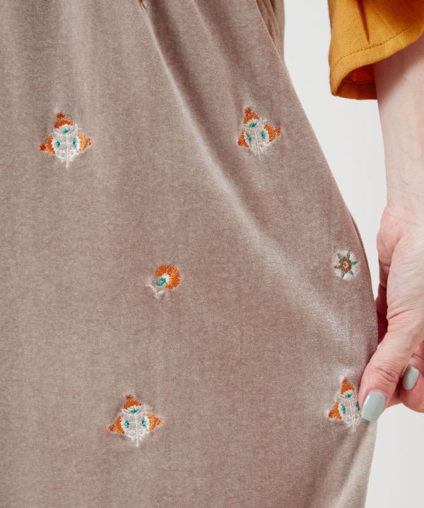 ベーシックで着回ししやすい、ストレートシルエットのベロアパンツ。光沢のある生地感で肌触り抜群。ウズベキスタンの伝統的なスザニ刺しゅうモチーフで、太陽、ザクロ、カーネーションなどの柄を全体にあしらった一枚。ウエストはゴム仕様なので、毎日履きたくなる楽な着心地です。