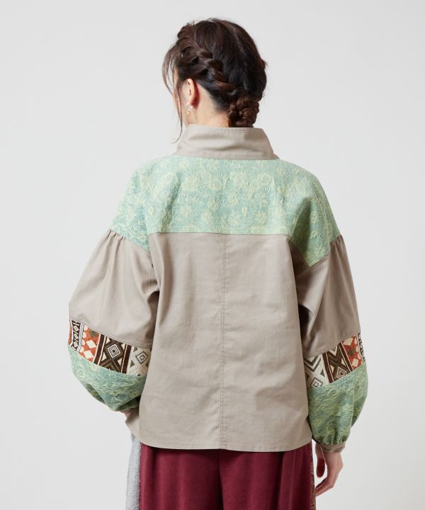 デニム・ストレッチツイル・ジャガードの異素材コンビネーションが目を惹くトップス。ヤオ族の伝統衣装からインスパイアを受けたデザイン。柔らかいストレッチ生地と軽やかな着心地、丸みのある袖感が特徴的。首元のボタンの留め方次第でシルエットを変えられるのもうれしいポイント。コーディネイトに個性をプラスしてくれるアイテムです。