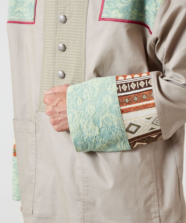デニム・ストレッチツイル・ジャガードの異素材コンビネーションが目を惹くメンズトップス。ヤオ族の伝統衣装からインスパイアを受けたデザイン。柔らかいストレッチ生地はユニセックスに着られる軽い着心地。コーディネイトに個性をプラスしてくれるアイテムです。