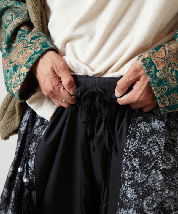 デニム・ストレッチツイル・ジャガードの異素材コンビネーションが目を惹くメンズパンツ。ヤオ族の伝統衣装からインスパイアを受けたデザイン。柔らかいストレッチ生地と軽やかな着心地、丸みのあるコクーンシルエットが特徴的。コーディネイトに個性をプラスしてくれるアイテムです。