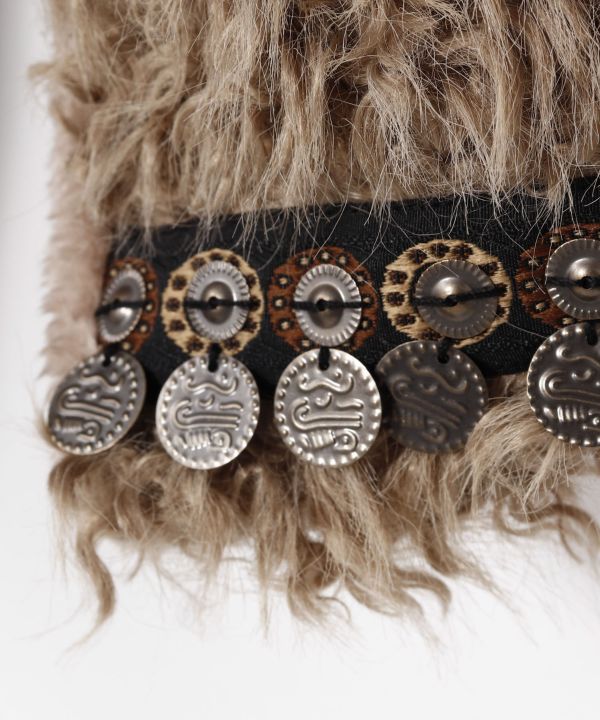 顔回りを温かく包み込んでくれるフード付きマフラー。チベットの遊牧民が着ている毛皮の防寒着をイメージした、裏地までこだわりが詰まったアイテム。