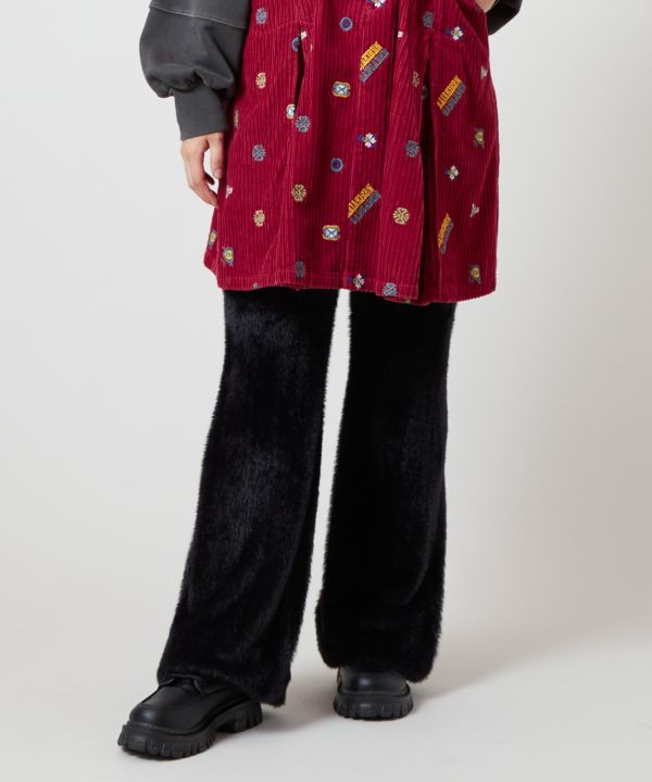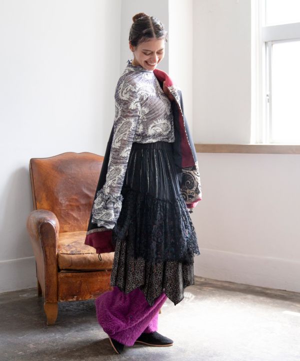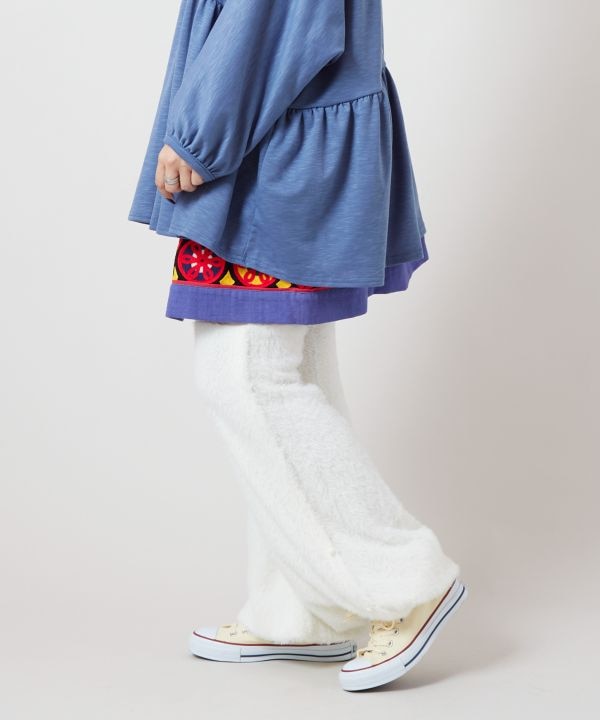 ストレッチ生地でゆったりとした着用感と、たっぷりとしたボリューム感が他にはないレギンス。カットソー生地と、ラクダの毛並みをイメージしたシャギー生地の組み合わせが特徴的。裾のゴムでトレンドのくしゅくしゅとしたシルエットに。レッグウォーマー見せも楽しめます。裾の飾りボタンにまでこだわった一枚です。
