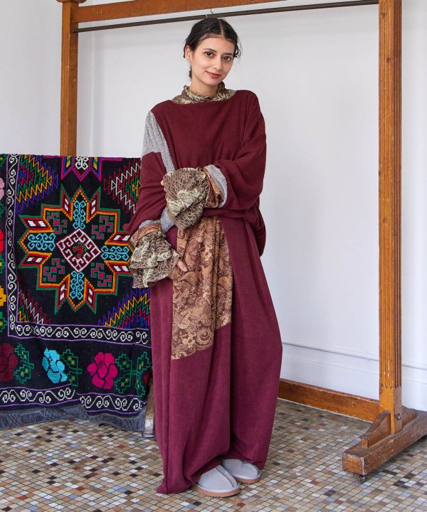 オリエンタルな花柄をあしらった柄生地と、肌触りのいいパイル地、ボアを組み合わせた、大胆なパッチワークが魅力のトップス。サイドの紐でシルエットを自在に変形させることが可能。短めに調節して着こなせば、スタイルアップ効果も期待できるアイテムです。着心地のよい伸縮素材使用。