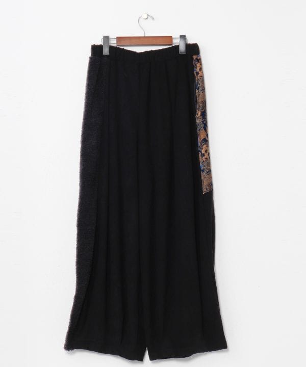 オリエンタルな花柄をあしらった柄生地と、肌触りのいいパイル地、ボアを組み合わせた、大胆なパッチワークが魅力のメンズパンツ。伸縮素材の生地感と、前が重なっているように見えるタック使いがポイント。ウエストはゴム仕様で、締め付け感が無く着られる万能アイテムです。