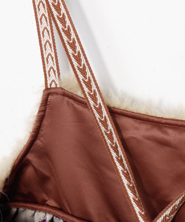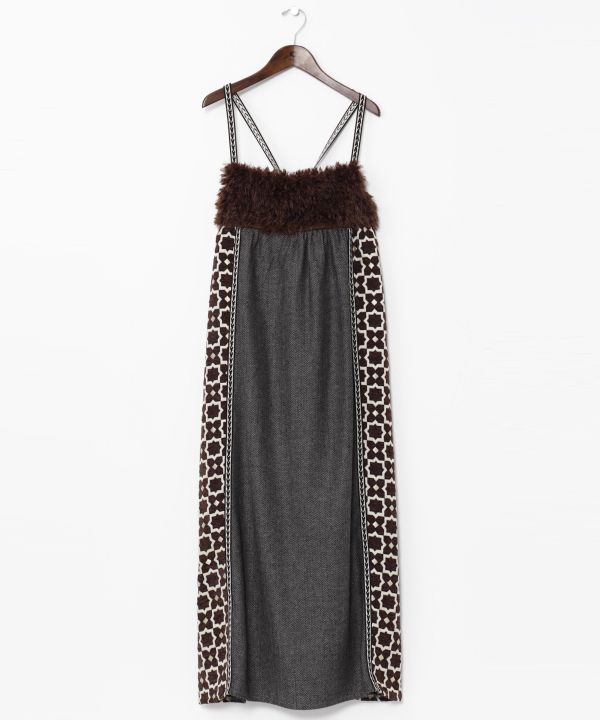 ミナレットのタイル模様からインスパイアを受けたジャカード生地、ツイード素材、ファー素材を組み合わせたワンピース。鮮やかな色彩と暖かみのある素材感が唯一無二の個性的デザイン。肩紐は調整可能。フェミニンな雰囲気も併せ持つ、コーディネイトの主役になるアイテムです。