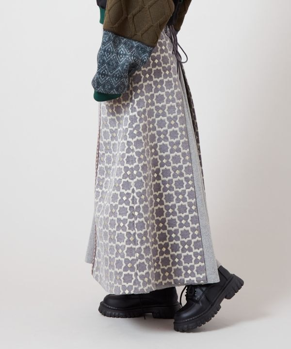 ミナレットのタイル模様からインスパイアを受けたジャカード生地、ツイード素材、ファー素材を組み合わせたスカート。鮮やかな色彩と暖かみのある素材感が唯一無二の個性的デザイン。Aラインと巻きスカート風のレイヤードがポイント。後ろウエストにはゴムが入っており、編み上げで調整可能。フェミニンな雰囲気も併せ持つ、コーディネイトの主役になるアイテムです。
