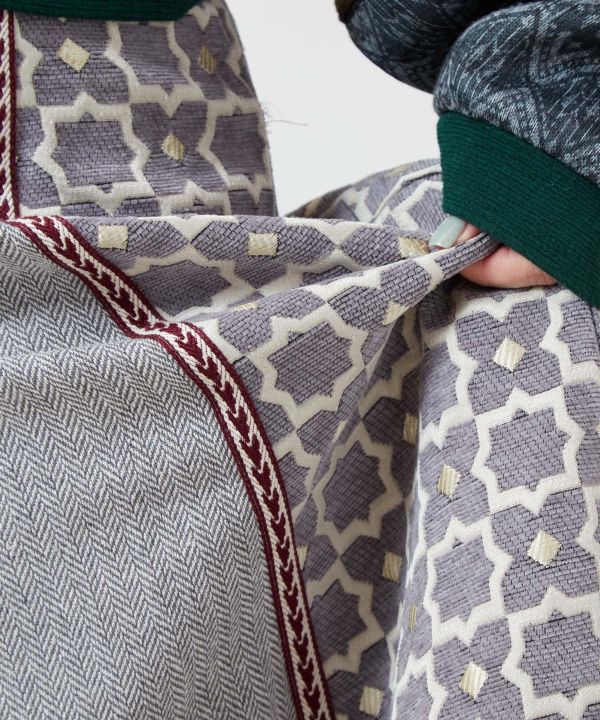 ミナレットのタイル模様からインスパイアを受けたジャカード生地、ツイード素材、ファー素材を組み合わせたスカート。鮮やかな色彩と暖かみのある素材感が唯一無二の個性的デザイン。Aラインと巻きスカート風のレイヤードがポイント。後ろウエストにはゴムが入っており、編み上げで調整可能。フェミニンな雰囲気も併せ持つ、コーディネイトの主役になるアイテムです。