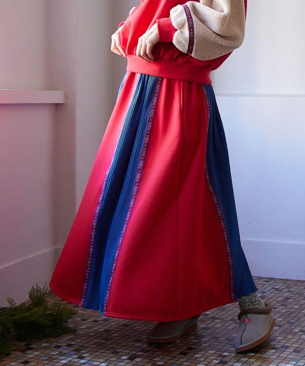 カラフルな部族として知られる、インド北西部ラジャスタン州のガラシア族からインスパイア。伸縮性のあるスウェット生地と、プリーツ素材の組み合わせが魅力のAラインスカート。ウエストはゴムでゆったりとしており、裏起毛で暖かく着られます。ビビットな色彩と煌びやかなテープでガラシア族を表現しました。