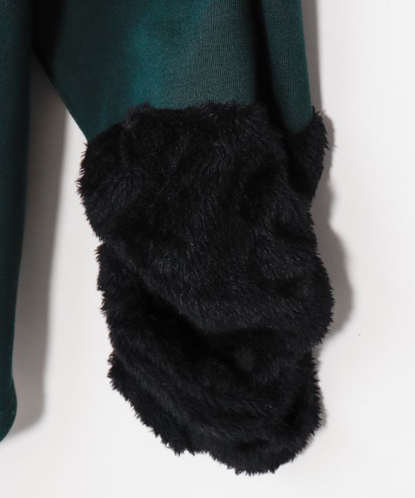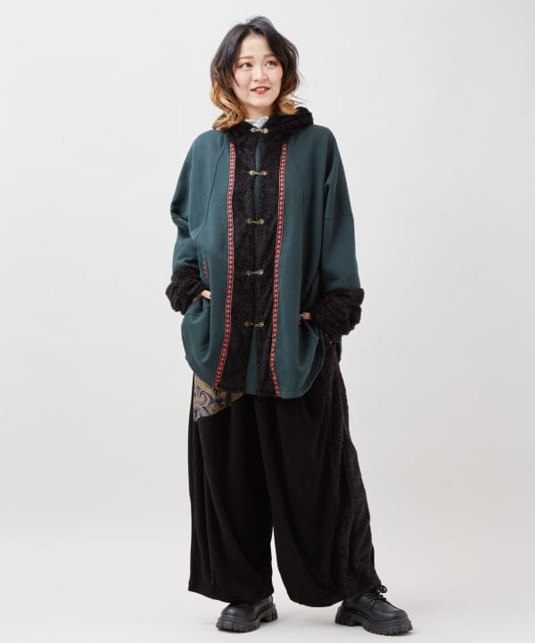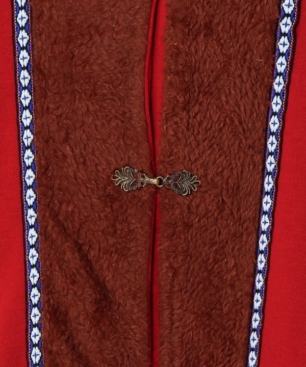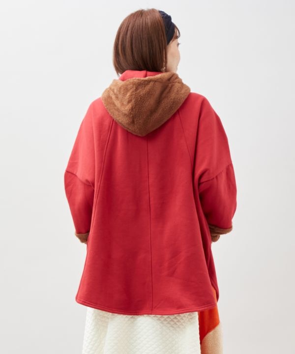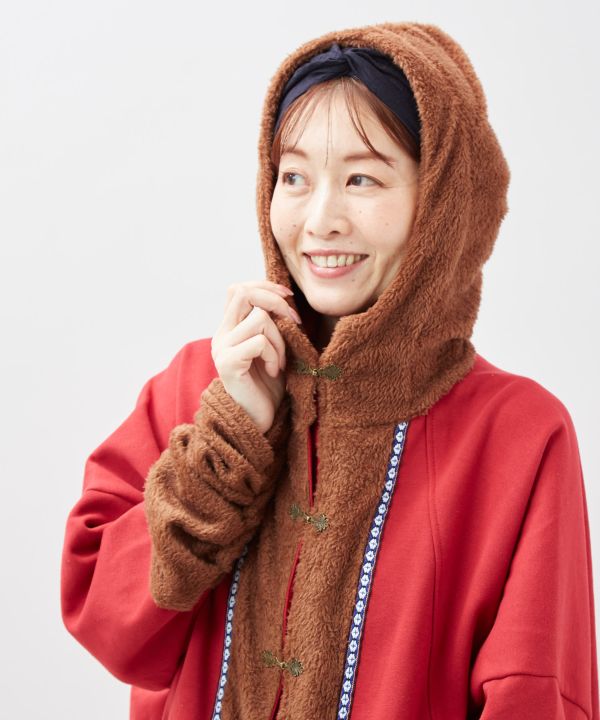 丸みのある形と袖のギャザーが個性的なフード付きジャケット。ボアのパッチワークとチロリアンテープが他には無いアクセントに。前開きにはメタルホックを使い、簡単に着脱できるのもポイント。一枚で暖かく着られる裏起毛生地と、中央アジアの色鮮やかなスカーフからインスパイアを受けたカラー展開が魅力の一枚です。