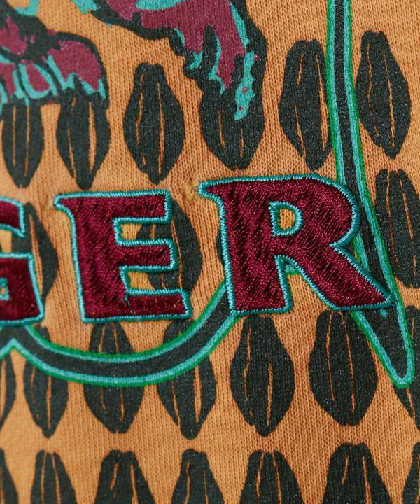 古着のような加工感の、裏起毛素材のメンズトレーナー。ボトムに合わせやすい丈感とレトロでオリエンタルなテキスタイルデザイン、袖のワンポイント刺繍が魅力。文明開化を題材に、海外と日本の文化を織り交ぜたレトロデザインシリーズ。