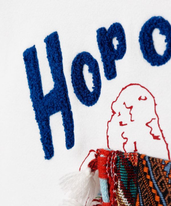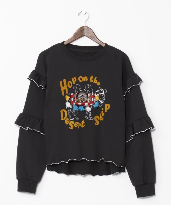 随所に施したフリルデザインが個性的なトレーナー。お尻が隠れる後ろ長めのハイローヘムで、足長効果も期待できます。胸元のフォークロア感溢れる刺しゅうは、文化の交差点であるウズベキスタンのラクダをモチーフに、様々な文化が入り混じった雰囲気とラグやカーペットを運ぶ様子を表現したもの。「HOP ON THE DESIERT SHIP」(砂漠の船に乗って)の相良刺しゅうもポイント。