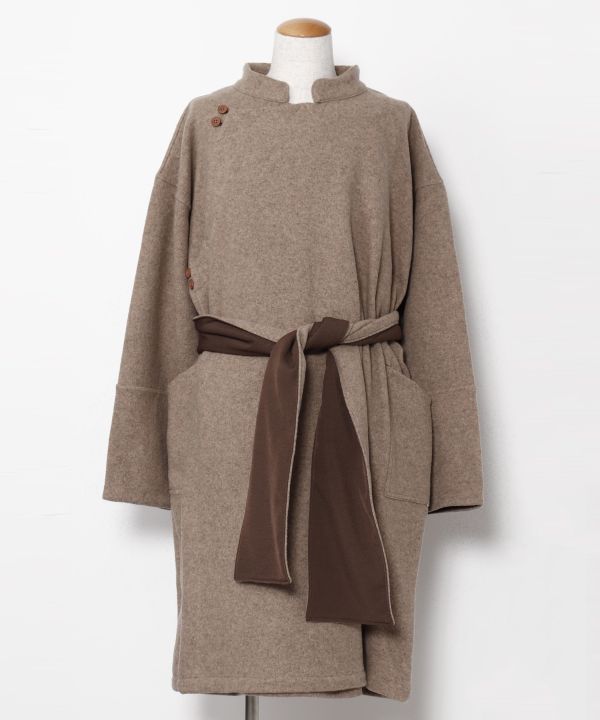 モンゴルの民族衣装「デール」から着想した、ウール100%のユニセックスで使えるロングコート。ノマド(遊牧民)スタイルの王道アイテムといえるデザインは、全体にスッキリしつつもゆったりとした腕や腰回りで、厚着の上に着ても動きやすい一品。別添の腰ひもはウエストマークやマフラーとしても使えます。