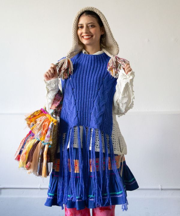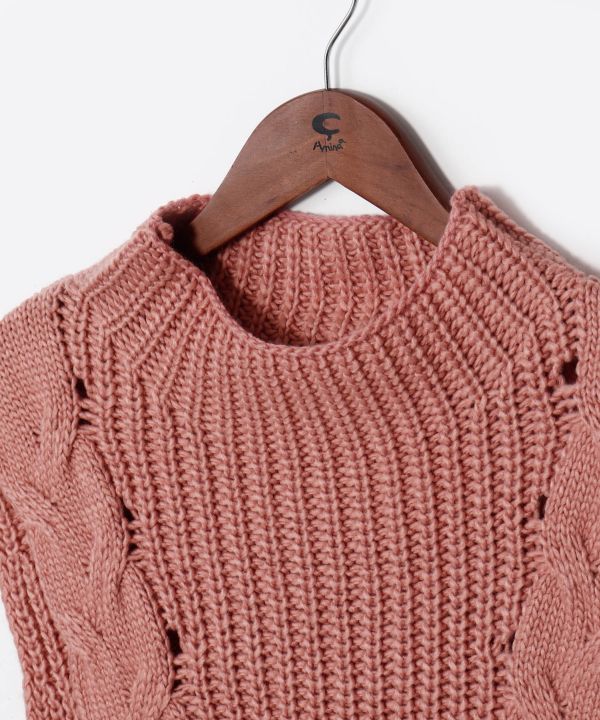 スタイルアップ効果間違いなし。スタンドカラーで首元あたたかなフリンジ付きニットベスト。斜めの柄編みがポイントな、レイヤードコーデに活躍するアイテム。