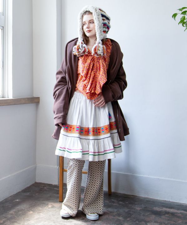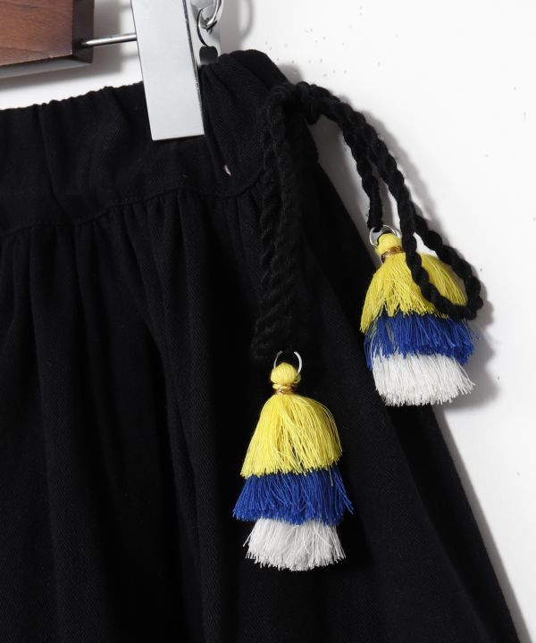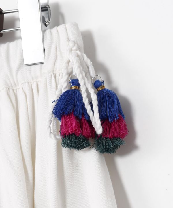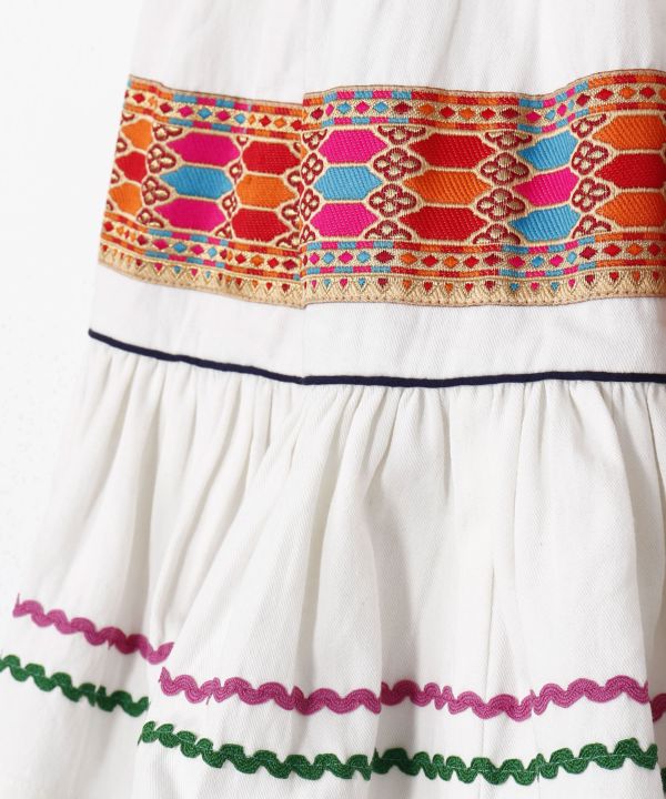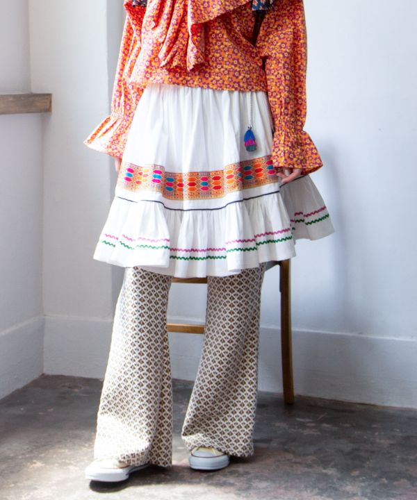 存在感のあるボリュームフリルがポイントの、パンツとのレイヤードコーデにぴったりなミニスカート。メキシコの民族衣装ウィピルから着想を得たデザインと、元気なカラーのカラフル織りテープで、見ているだけでパワーをもらえるアイテムです。ウエストゴム、サイドにストリングとタッセル付き。