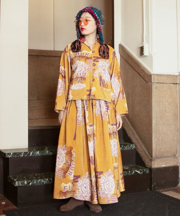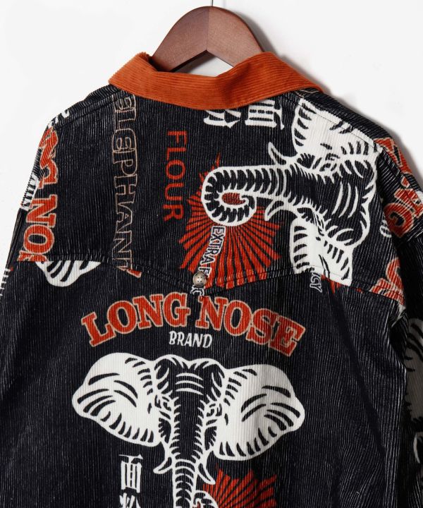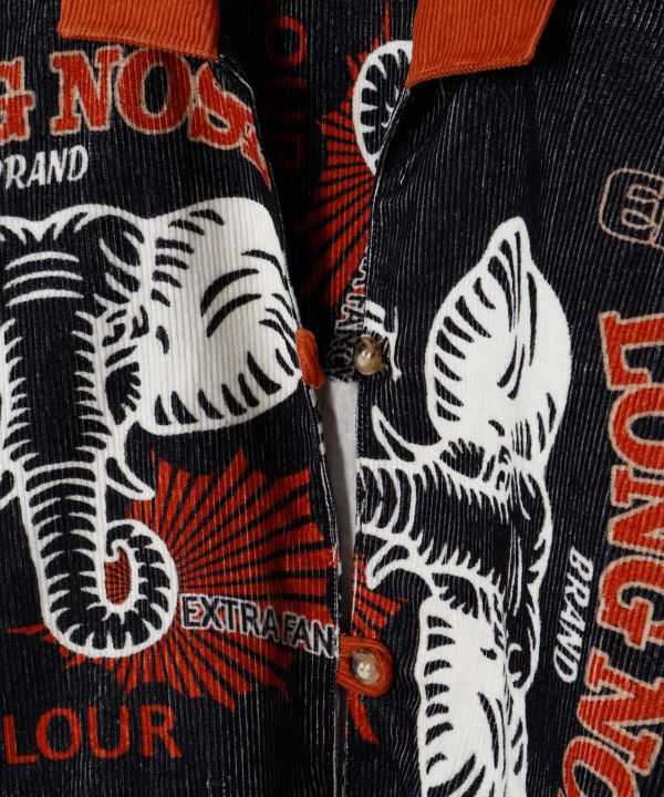 ジャケットとしても活躍する、あたたかみのある地厚コーデュロイ生地のシャツ。文明開化を題材に、海外と日本の文化を織り交ぜたレトロでオリエンタルなテキスタイルデザインが魅力の一枚。