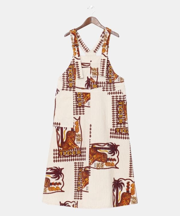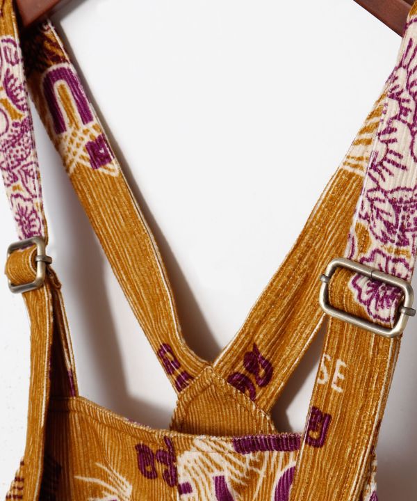 あたたかみのある地厚コーデュロイ生地のサロペットスカート。一味違うカジュアルコーディネートに大活躍。胸元にポケットあり。文明開化を題材に、海外と日本の文化を織り交ぜたレトロでオリエンタルなテキスタイルデザインが魅力の一枚。