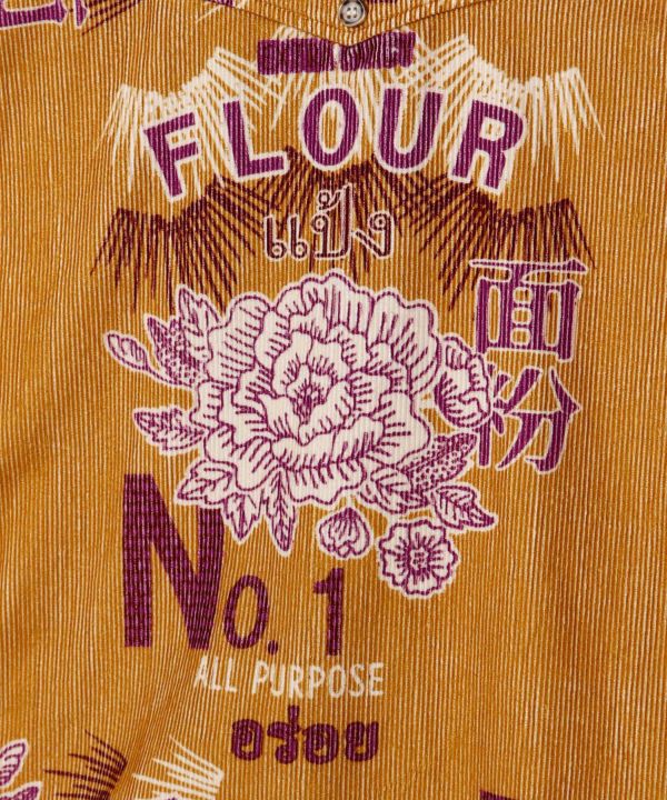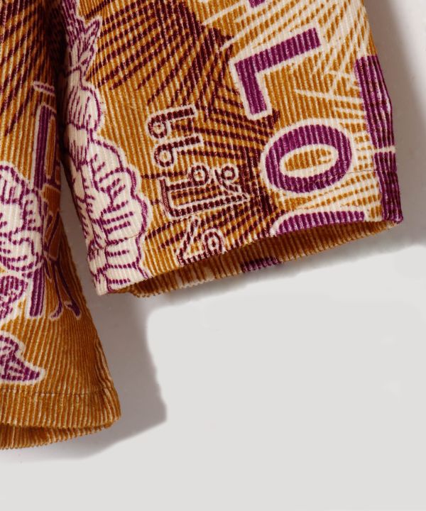 ジャケットとしても活躍する、あたたかみのある地厚コーデュロイ生地のメンズシャツ。文明開化を題材に、海外と日本の文化を織り交ぜたレトロでオリエンタルなテキスタイルデザインが魅力の一枚。