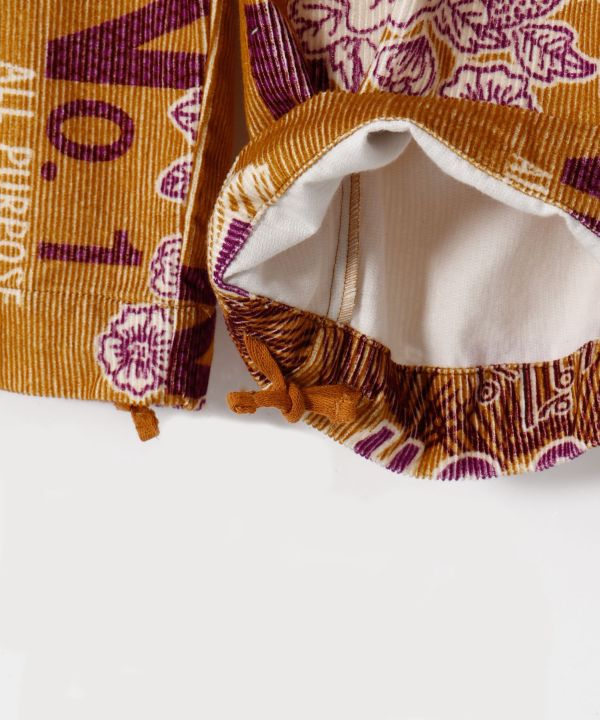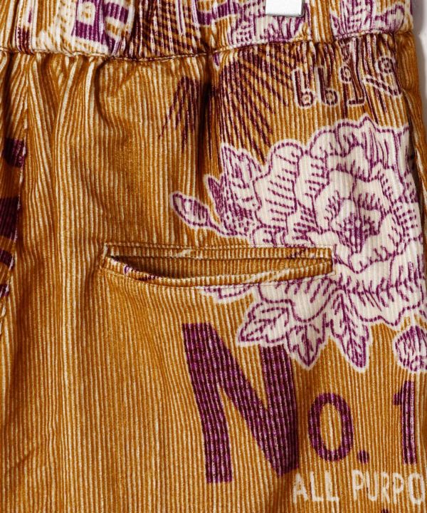 あたたかみのある地厚コーデュロイ生地のメンズパンツ。ゆったりとしたボリュームで、サイズレスに着ることができます。文明開化を題材に、海外と日本の文化を織り交ぜたレトロでオリエンタルなテキスタイルデザインが魅力の一枚。