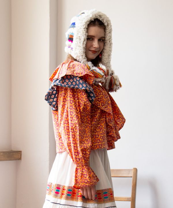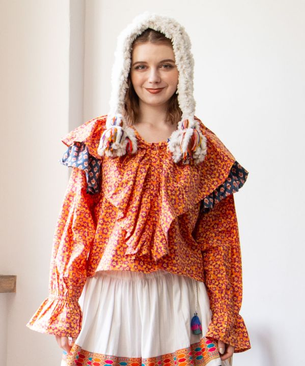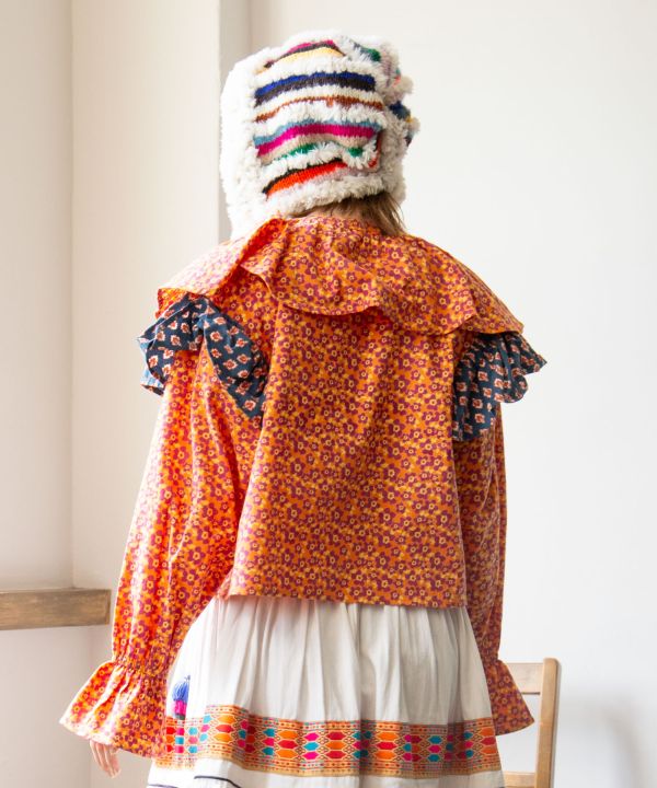 レトロポップな花柄プリントが魅力的な、シーズン問わず着ることができるトップス。しっかりとしたやわらかなコットン素材で、取り外し可能な襟付きの2WAY仕様。ボリュームのある付け襟と袖のフリルが、顔周りを華やかにみせてくれます。