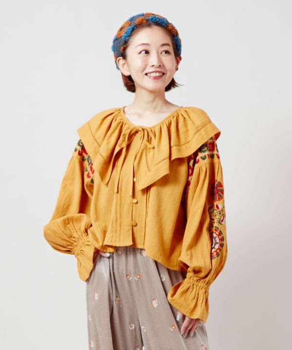 レースを施したキャンディースリーブの袖と、大きな襟が魅力的なトップス。印象的な襟は取り外し可能なWAY仕様。袖口はゴム入りで長さの調整可能。身頃のピンタックで上品さを、肩から袖にかけての刺しゅうで華やかさをプラス。花の形のボタンが目を惹きます。付け襟を腰に巻くトレンドのレイヤードスタイルにもおすすめ。刺しゅうはウズベキスタンのスザニ刺しゅうがモチーフ。柄の意味 ザクロ:豊かさの象徴 花:大地に根差した生命の象徴 太陽:すべてのエネルギーの源