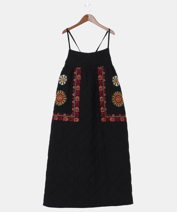 キルティング素材のボリューム感と、華やかな刺しゅうが目を引くワンピース。肩紐で着丈の調整が可能。サイドポケット付き。刺しゅうはウズベキスタンのスザニ刺しゅうがモチーフ。柄の意味 ザクロ:豊かさの象徴 花:大地に根差した生命の象徴 太陽:すべてのエネルギーの源