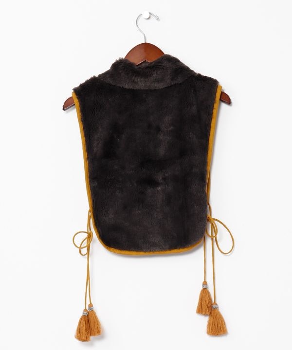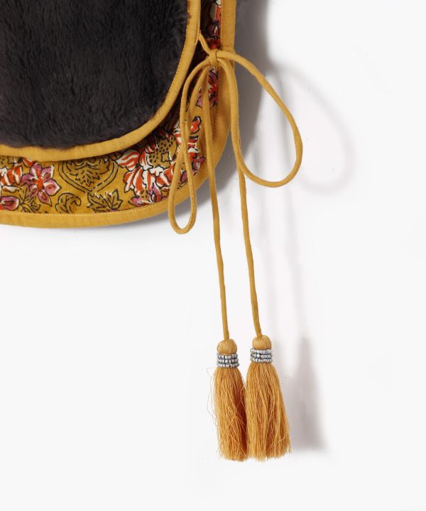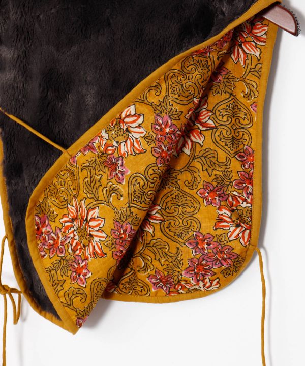 ふわふわのファーが温かい、ファスナー付き立ち襟プルオーバーベスト。インドのブロックプリント風花柄生地の裏地と、同色のパイピング・タッセルがポイント。いつものコーディネートにプラスして、アウターからチラリと覗くファー素材が着こなしのアクセントに。