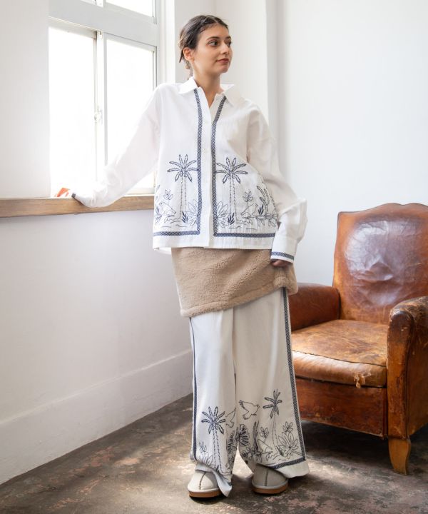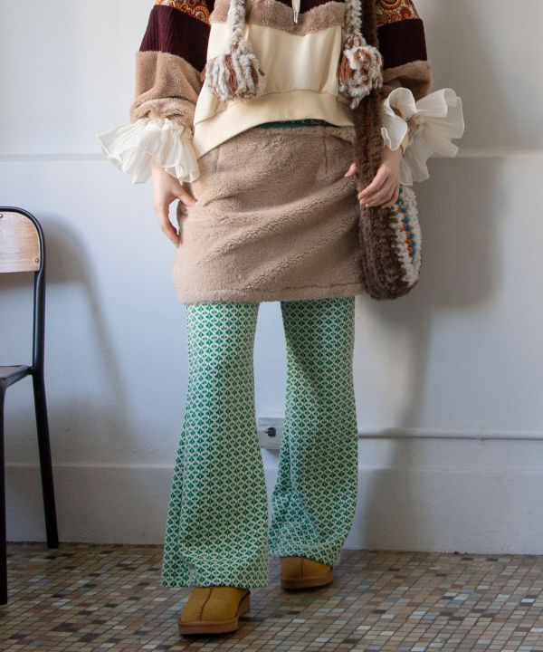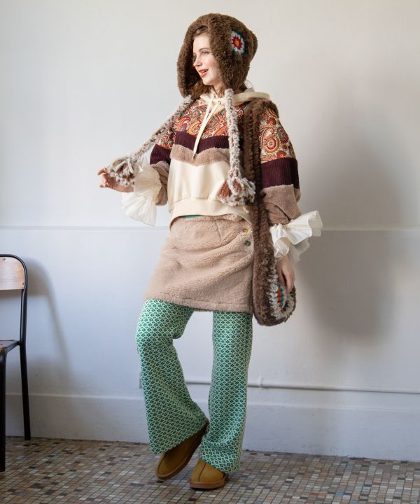 ふわふわのファーが温かい、裏地付きミニスカート。インドのブロックプリント風花柄生地を使用した、くるみボタンがポイント。短丈トップスと合わせたレイヤードスタイルがおすすめです。いつものコーディネートにプラスするだけで雰囲気をアップさせるアイテム。