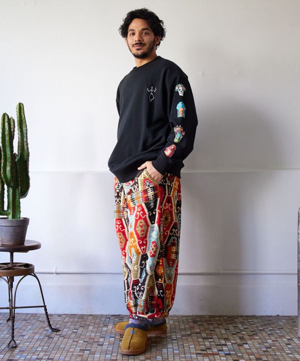 【Amina×grn】暖かく軽量な、普段使いに最適なやわらかフリースメンズパンツ。シルクロードにある絨毯の産地「カーペットベルト」から柄の着想を得た、オリジナリティあふれる柄が魅力的。両サイドにポケット付き。