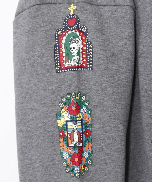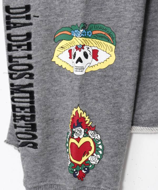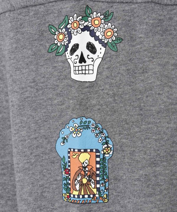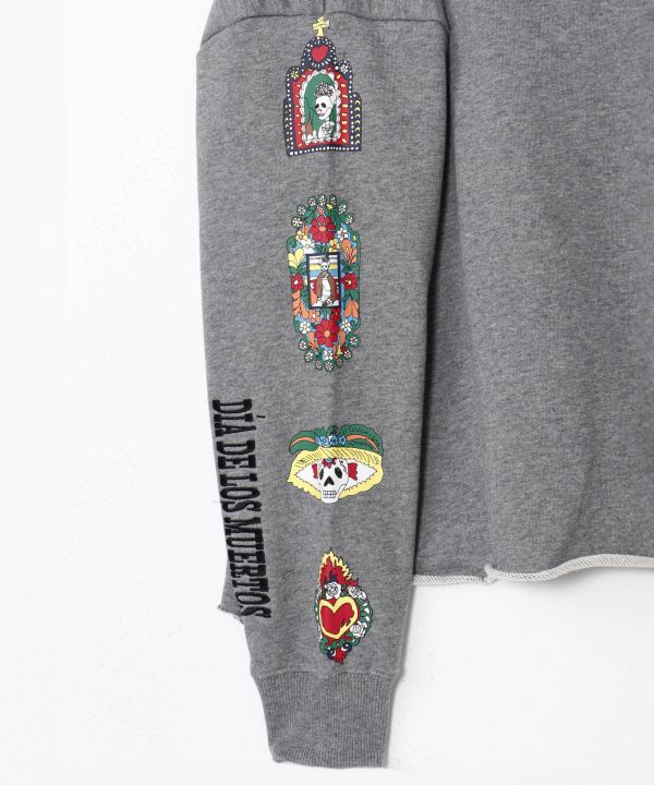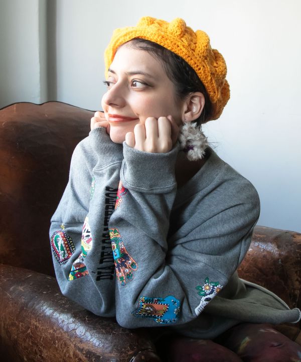 【Amina×grn】しっかりとした裏毛素材を使用した、刺しゅうとプリントが贅沢なトップス。伸びのいい素材で着心地抜群。裾は古着感あふれるカットオフ仕様で、カジュアルに日常で大活躍。袖にはスペイン語でDia de los muertos(死者の日)の刺しゅうと、オフレンダ(祭壇)に飾られる写真をモチーフにしたカラベラ達のプリントを配置しました。