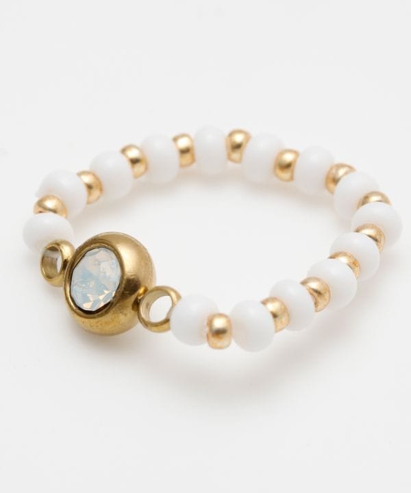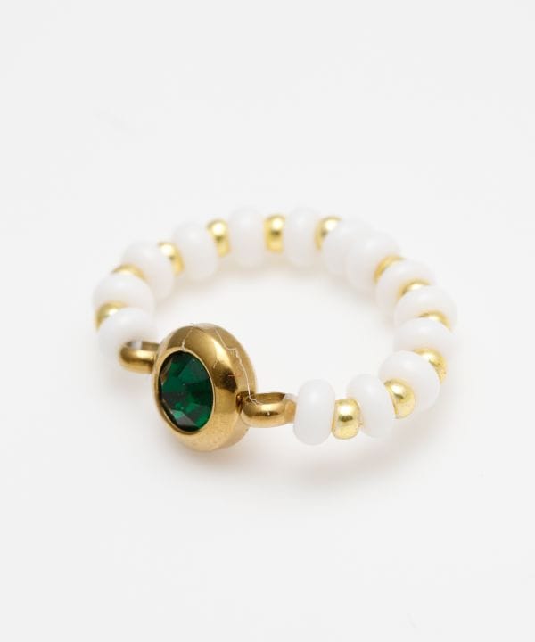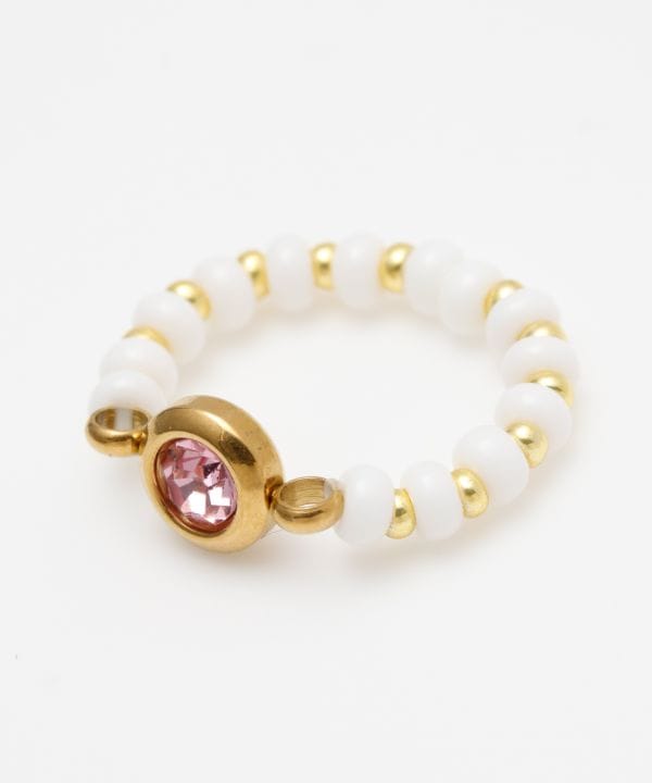チェコガラスを誕生石の色であしらって作られたリング。まわりはパールカラーの石で囲われていて合わせやすいデザインです。