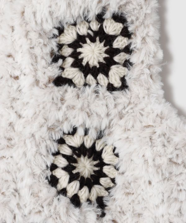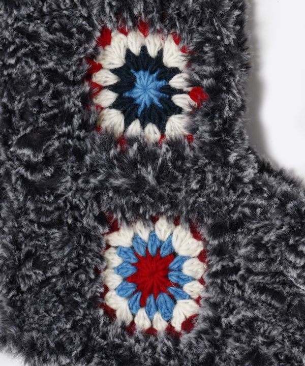 太めのファー糸が柔らかく暖かい、ネパールの職人さんによる手編みのベスト。カラフルなクロシェ編みとコンチョボタンがポイント。短め丈なので、レイヤードコーデのアクセントにおすすめです。