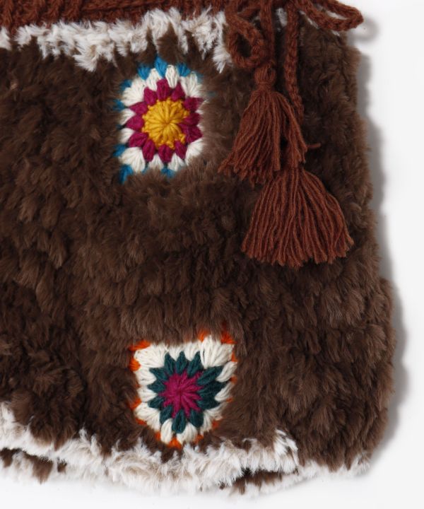 太めのファー糸が柔らかく暖かい、ネパールの職人さんによる手編みのスカート。カラフルなクロシェ編みとサイドのタッセル紐がポイント。パンツと合わせたレイヤードコーデにおすすめです。