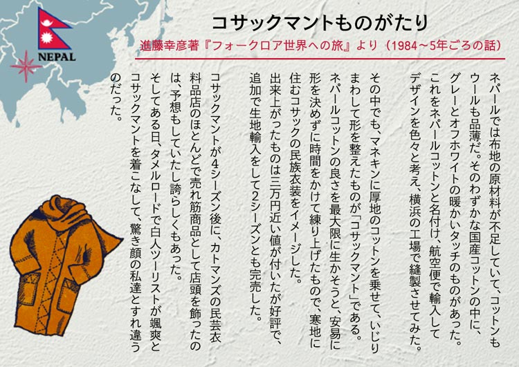 チャイハネの原点「コサックマント」が進化。長年愛されてきたデザインや素朴な風合いは活かしつつ、機能性がアップ!より幅広く使いやすくなりました。前ボタンが付いたことにより寒い日の防寒性が上がり、またフード付きマフラーストールが襟元のボタンで着脱可能となりました。しっかりとした肉厚生地の重厚感のあるアウターで、一枚羽織れば旅するノマドなスタイリングが完成。太いコットンの糸でザックリと手で織られた、現地の言葉でGheri(ゲーリ)と呼ばれるネパールの生地が魅力。着るほどに味わいと愛着が増す逸品です。