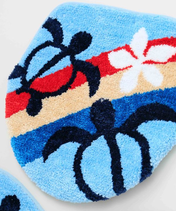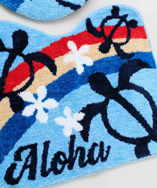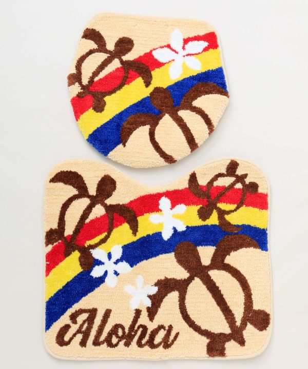 ハワイの守り神ホヌと虹が描かれたトイレセット。やわらかな色合いと立体的な刺しゅうがポイントで、毎日の空間を明るくハワイアンに彩ります。フタカバーとマットのセットです。
