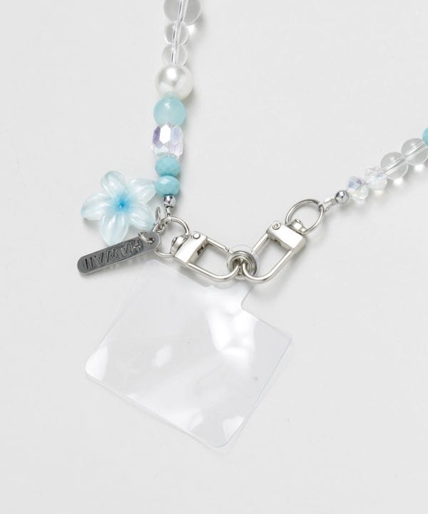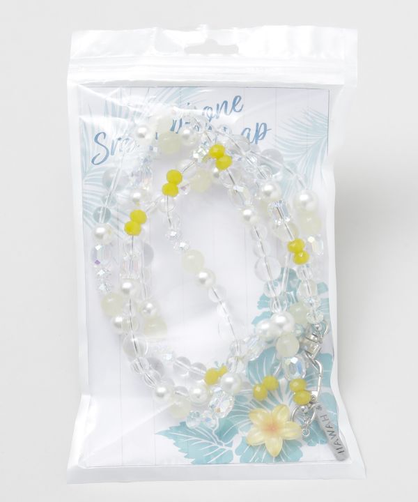 プルメリアのモチーフがやさしくきらめくロングタイプのスマホストラップ。肩掛けできる仕様で、外出時にもスマホを安心して持ち歩けます。ハワイの花のように明るく上品なアクセントをプラスします。