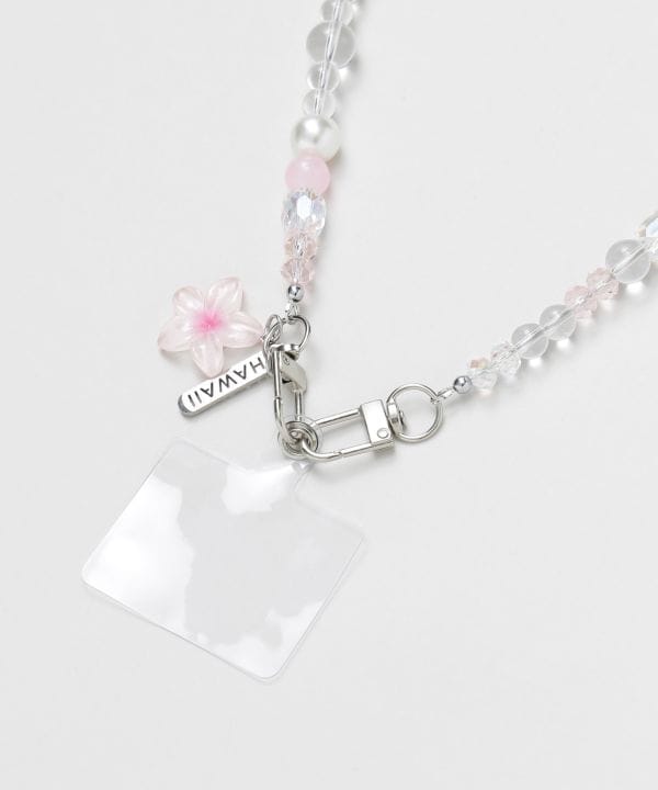 プルメリアのモチーフがやさしくきらめくロングタイプのスマホストラップ。肩掛けできる仕様で、外出時にもスマホを安心して持ち歩けます。ハワイの花のように明るく上品なアクセントをプラスします。