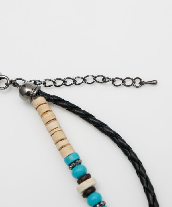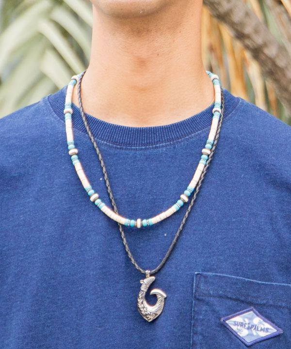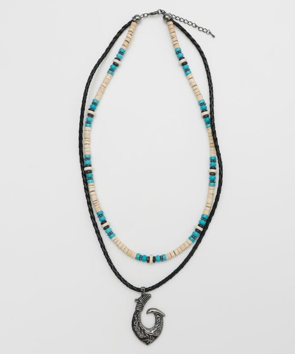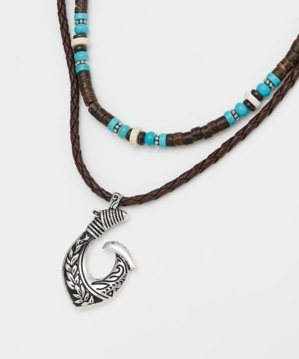メタル×天然素材を組み合わせたボリュームネックレス。フィッシュフックモチーフは幸運を呼ぶお守りとされ、旅や海を感じるスタイルにぴったり。存在感あるデザインで胸元を印象的に演出します。