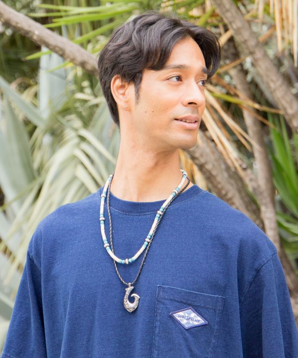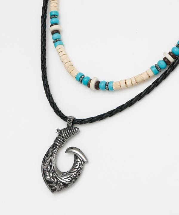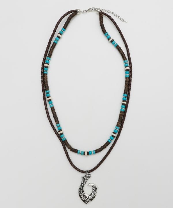 メタル×天然素材を組み合わせたボリュームネックレス。フィッシュフックモチーフは幸運を呼ぶお守りとされ、旅や海を感じるスタイルにぴったり。存在感あるデザインで胸元を印象的に演出します。