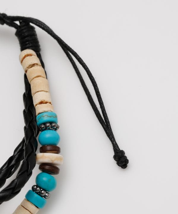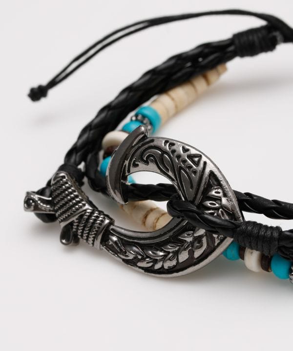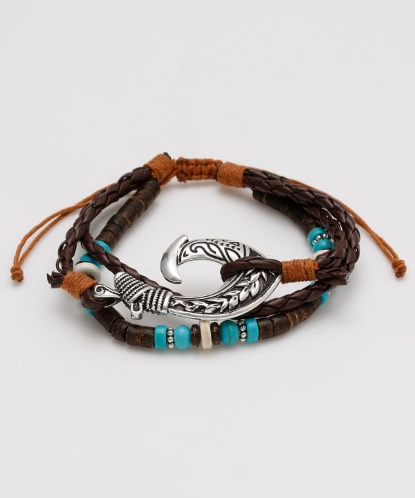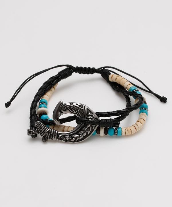 天然素材の風合いが魅力のメンズブレスレット。編み込みデザインとメタルパーツが程よく調和し、カジュアルスタイルを格上げ。フィッシュフックモチーフは幸運を呼ぶお守りとして人気のモチーフです。