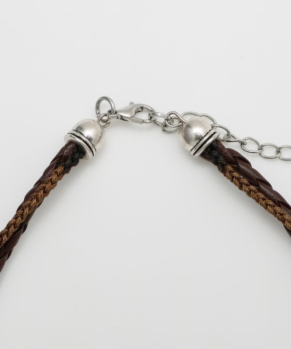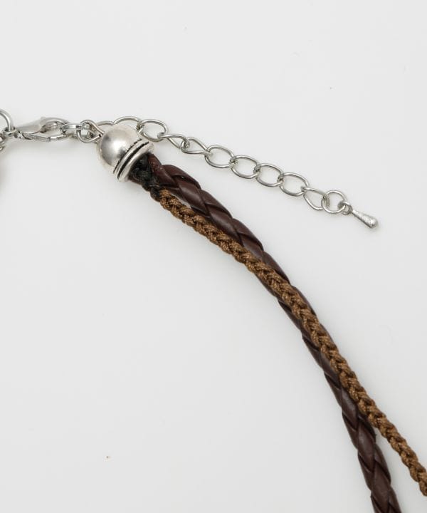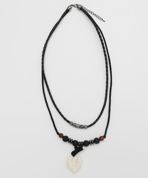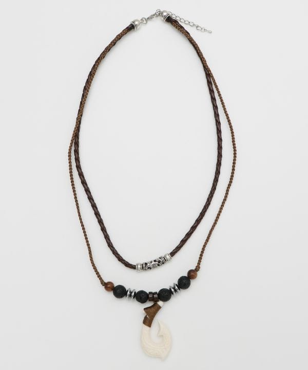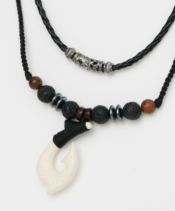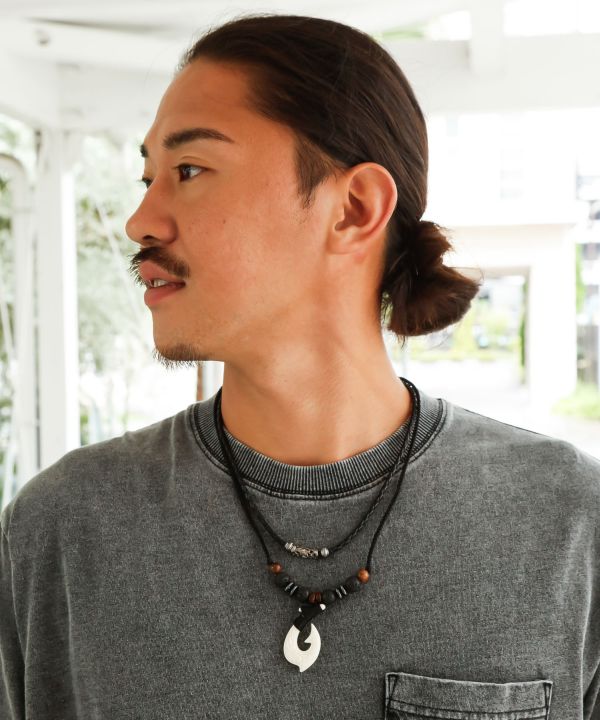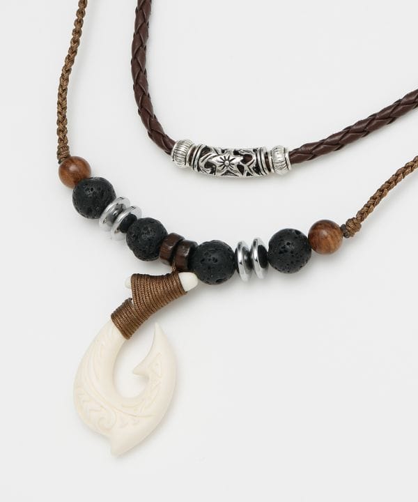 ボーン風モチーフと天然素材を組み合わせた存在感あるネックレス。フィッシュフックは幸運を呼ぶお守りとして知られ、ハワイの海のスピリットを感じるデザイン。ナチュラルで力強い印象を与えます。