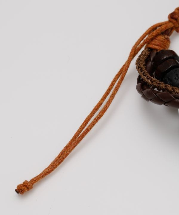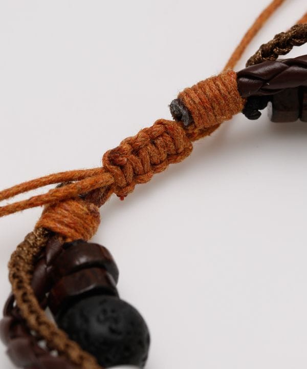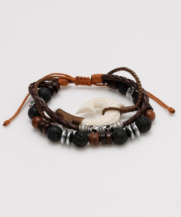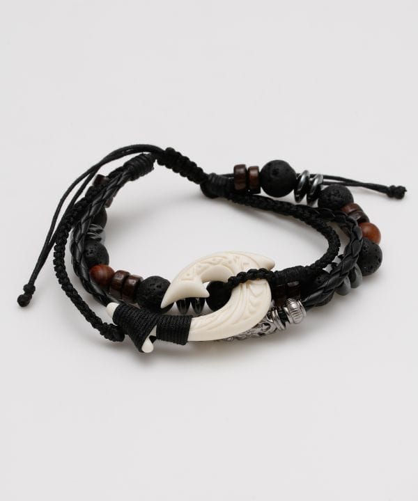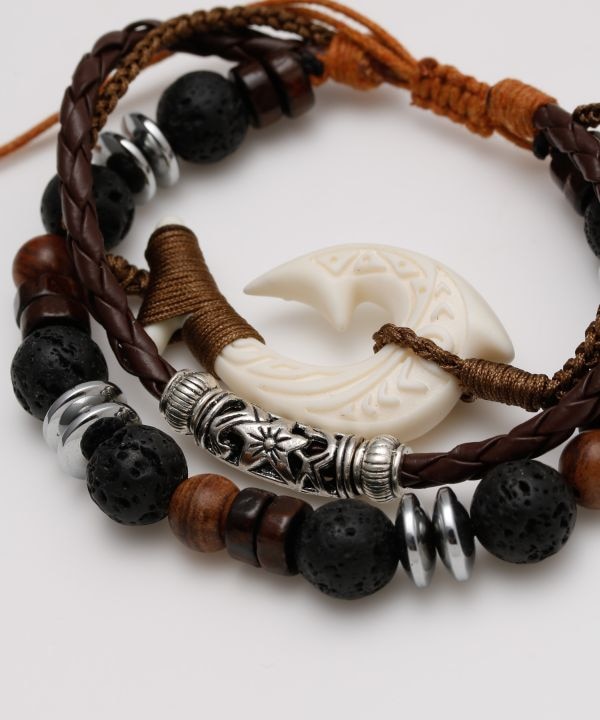天然素材の風合いとボーン調のモチーフが魅力のメンズブレスレット。編み込みデザインで手元を個性的に彩ります。フィッシュフックモチーフは幸運を呼ぶお守りとされ、自然体のスタイルにマッチします。