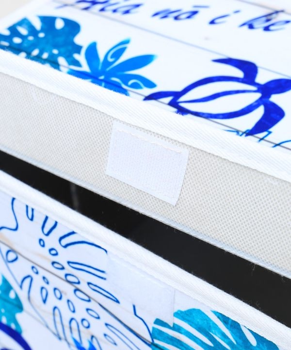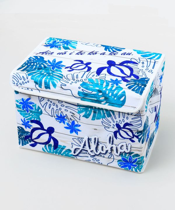 ハワイらしいプルメリア柄とホヌ柄がかわいい収納ボックス。使わないときはコンパクトに畳める便利な仕様です。リビングや子ども部屋などに置くだけで、明るくリゾート感のある空間を演出します。蓋つきタイプ。