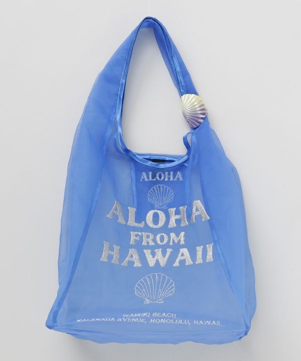 シェル型ヘアクリップが付いたエコバッグ。クリップはハンドル部分に付けても可愛く、バッグ自体は折りたたんでコンパクトに収納可能。内ポケットとゴムバンド付きで機能的。お買い物や旅行のおともにおすすめ。