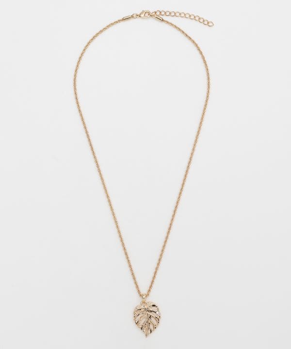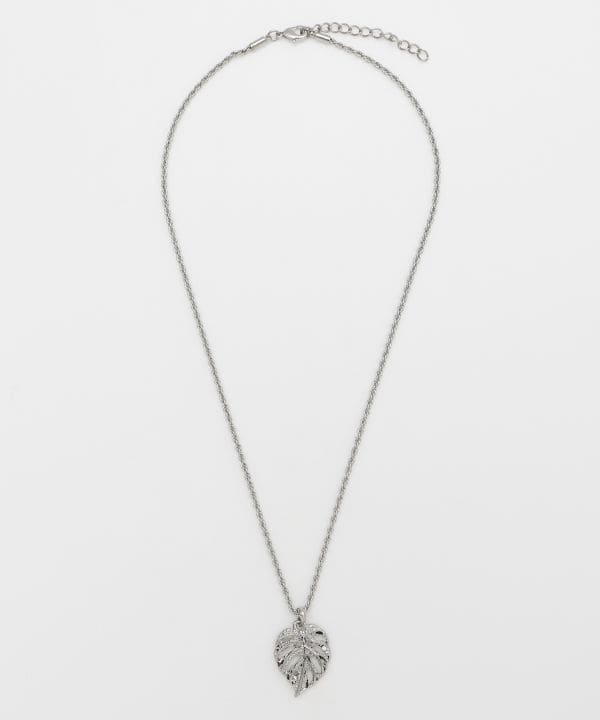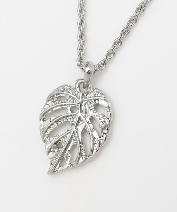 モンステラモチーフのネックレス。ハワイの文化ではモンステラは自然との調和を象徴する植物とされ、大きく美しい葉が癒しのエネルギーを感じさせます。ハワイアンジュエリー調の刻印が上品な輝きを添えるアクセサリーです。