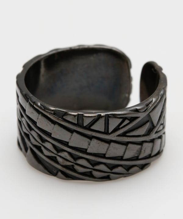 ポリネシアンタトゥー風の彫刻が印象的なメンズリング。重厚感のあるデザインで存在感を放ちます。力や勇気を象徴するモチーフとして、個性的で力強いスタイルを演出します。