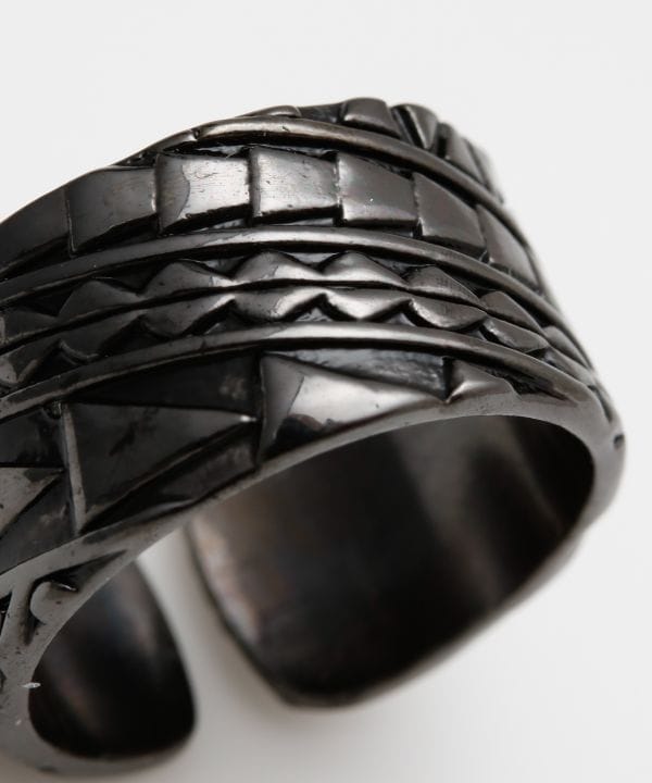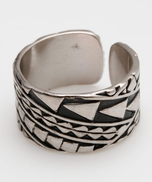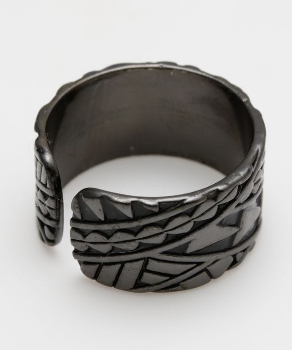 ポリネシアンタトゥー風の彫刻が印象的なメンズリング。重厚感のあるデザインで存在感を放ちます。力や勇気を象徴するモチーフとして、個性的で力強いスタイルを演出します。