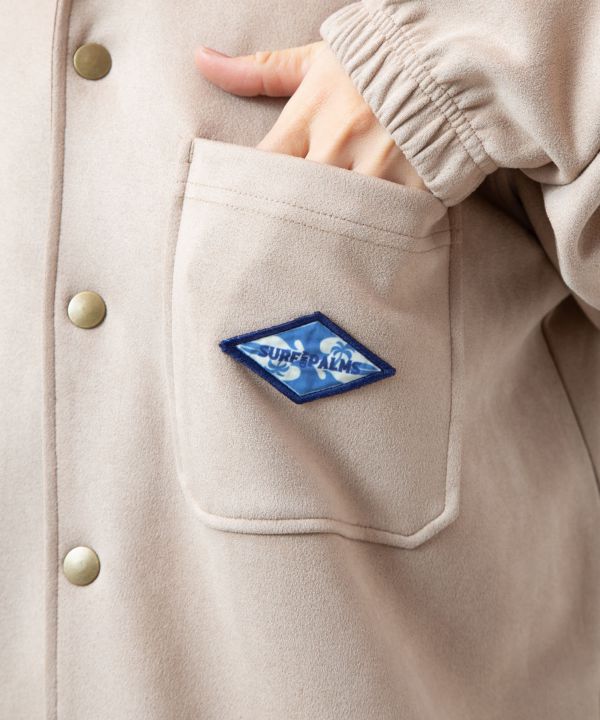 ノースショアのサンセットをイメージしたプリントが印象的なメンズアウター。カットスエード素材で伸縮性があり、さらっとした肌触りが快適です。襟元にはコーデュロイを使用し、カジュアルな雰囲気に。まだ肌寒い初春から活躍するアイテムです。