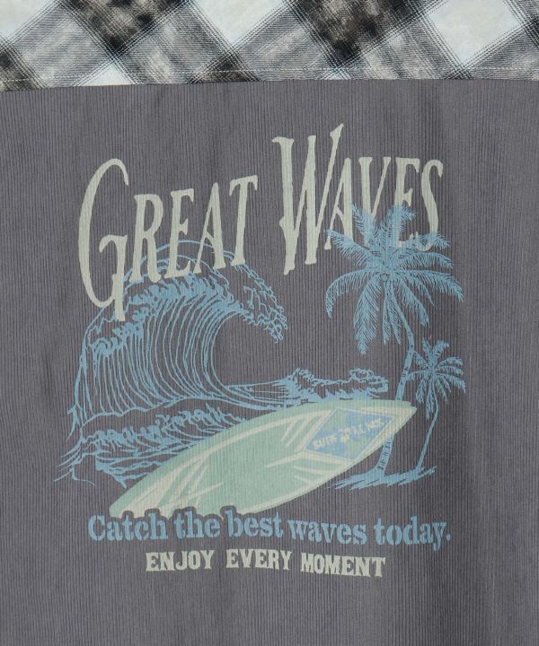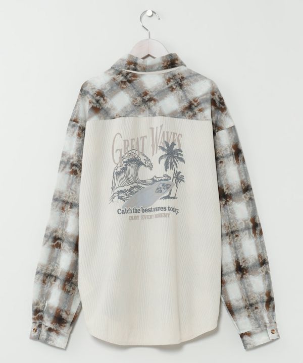 加工感のある薄手のチェック生地と細畝のコーデュロイを切り替えたメンズシャツ。背中のプリントが印象的で、一枚でも羽織りとしても活躍します。軽やかな素材感で、初春から春にかけて長く着られるデザイン。Tシャツやタンクトップとの重ね着スタイルにもおすすめです。